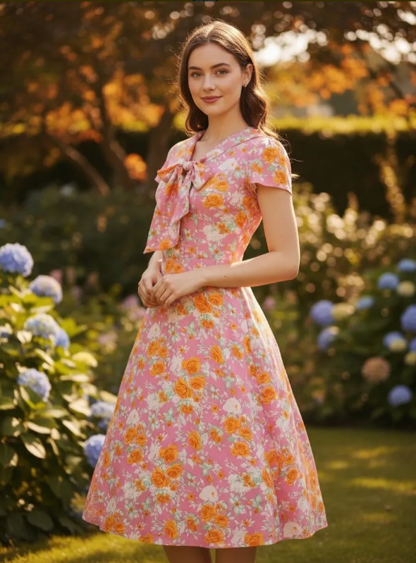 Vestido Godê Floral Com Laço Rosa Com Flores